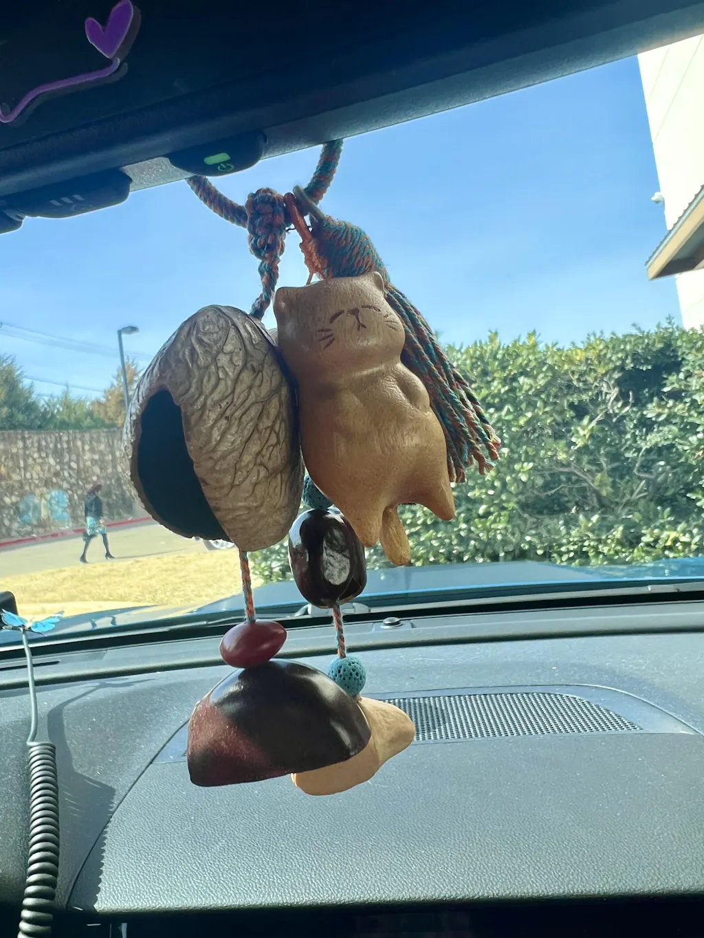 I love the kitty charm and how it is combined with other seed pods to make a nice little sound that's soothing. The kitty charm is smoothly carved wood and the quality of the findings used is top notch. It is hanging from my car mirror so I look at it often and love it.